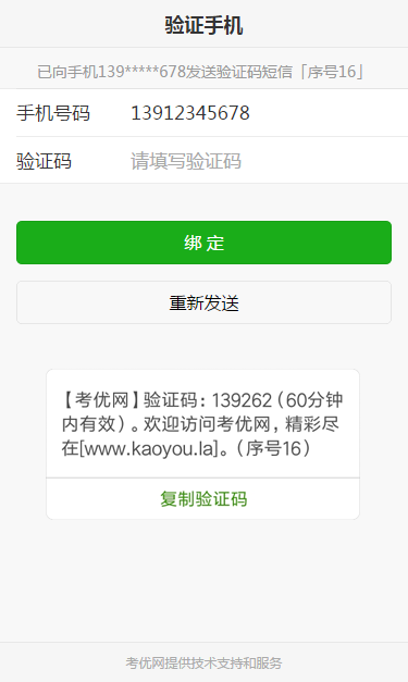 为便于联系考生,缴费前需验证考生联系电话的有效性。系统向考生手机发送随机验证码短信,考生收到验证码短信后,填写收到的验证码完成验证。
