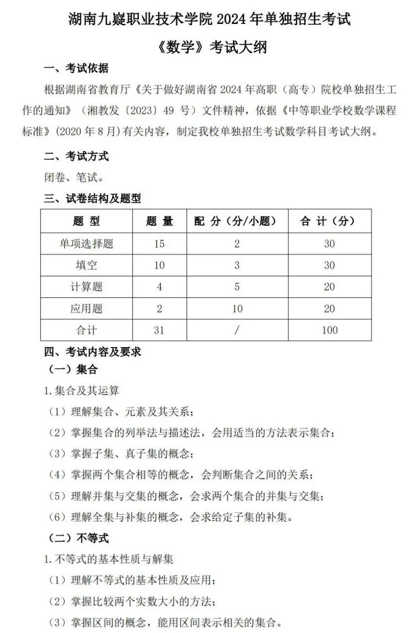 湖南高职单招考试网给大家带来湖南九嶷职业技术学院2024年高职单招数学考试大纲,内容如下: